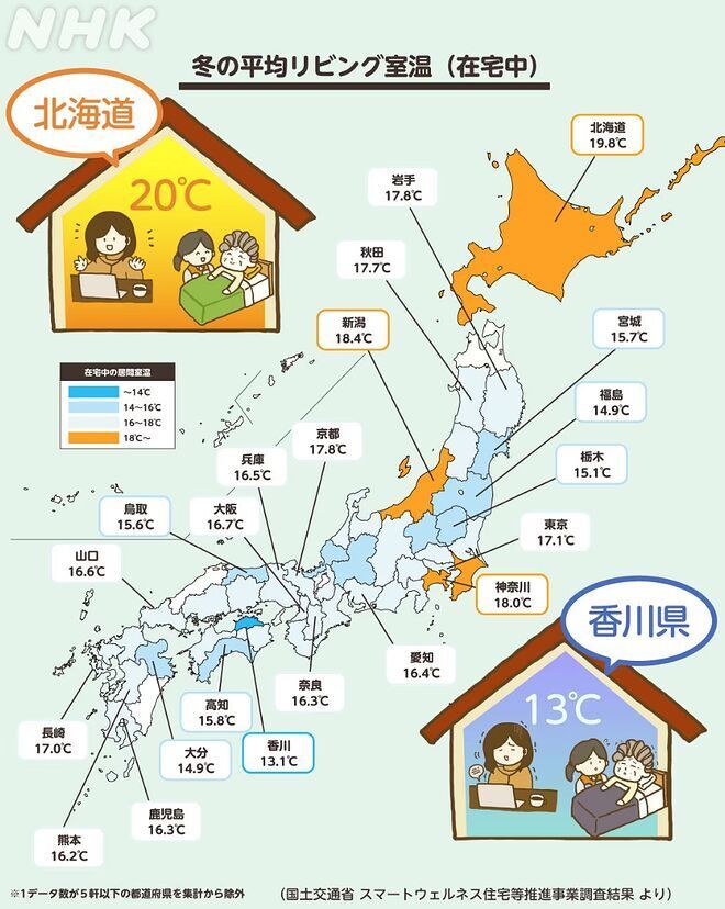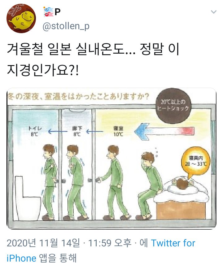 実際、日本の調査結果でも冬の家の中の平均気温は12~13度前後らしく、毎年家の中で1,000人が凍タヒするそうです