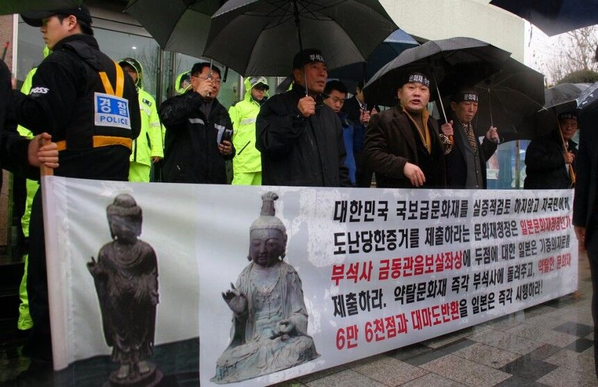 2013年2月1日、ソウル鍾路区の日本文化院前で、愛国国民運動大連合など市民団体の会員たちが金銅観音菩薩坐像など日本が略奪した文化財の返還を日本に要求している。