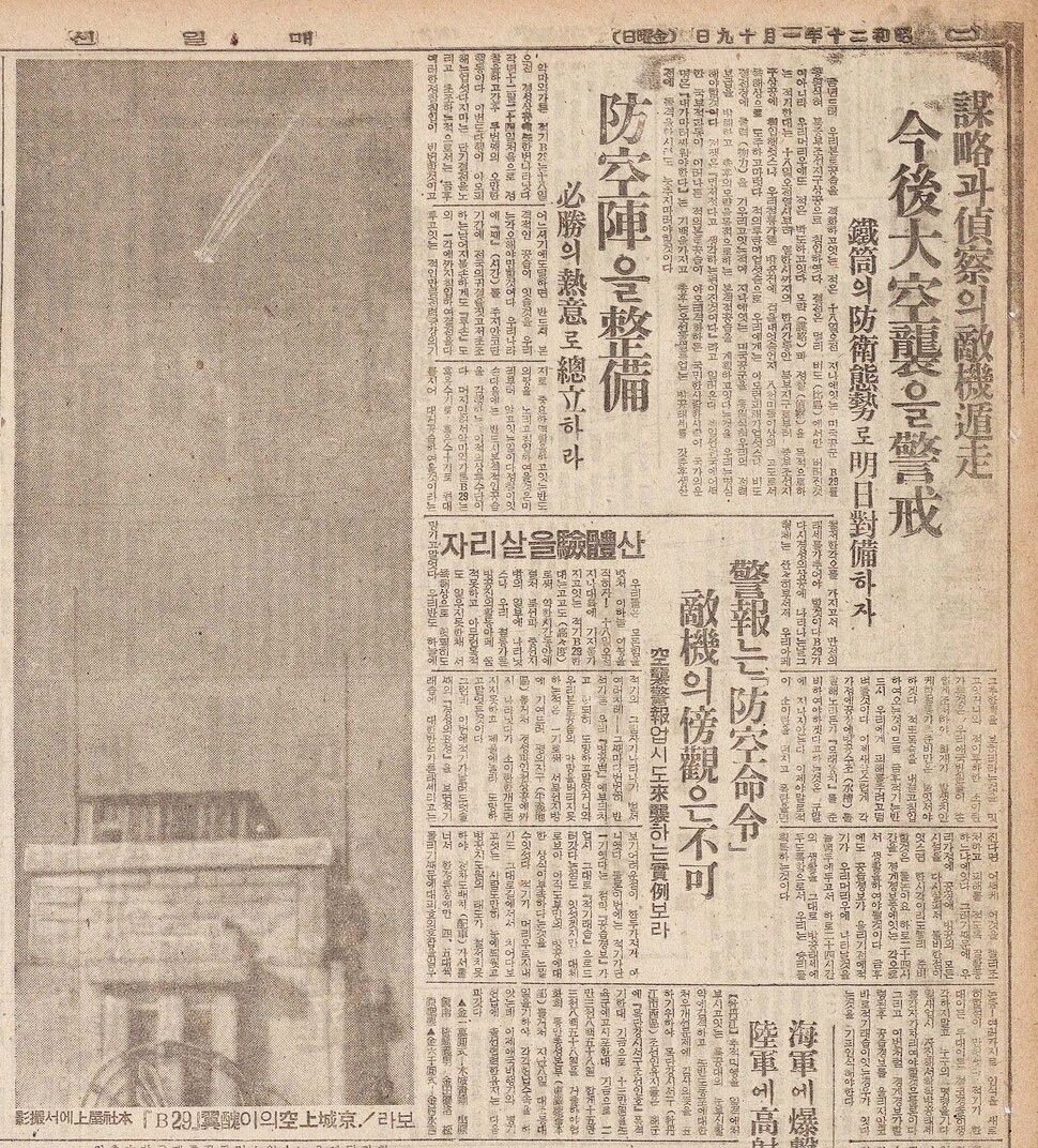 米空軍の写真を毎日新聞が掲載し、空襲が差し迫っていることを知らせる。